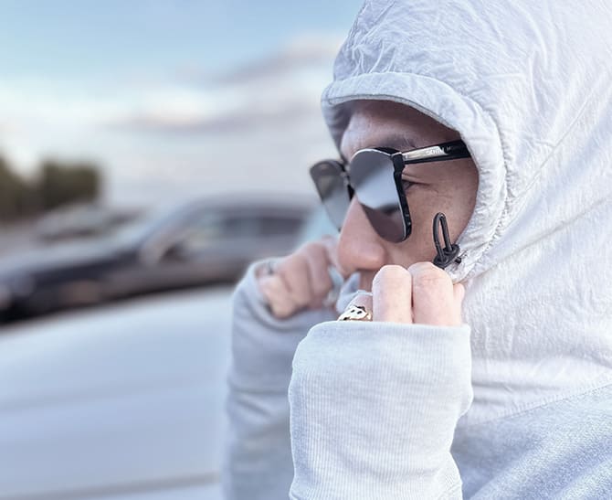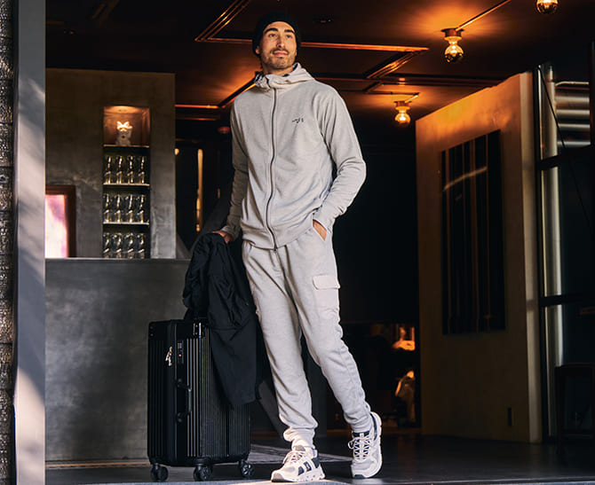 ダブルジップアップパーカーの素材は、裏毛(裏がタオル地)に加え、吸水速乾の機能があり快適に着用する事ができます。フードにはドローコードを使用し、ワークアウト中にも風を防げる事や、前身のジップを閉めた際、襟がきれいに立つシルエットはブランドの拘りポイントです。サムホール(袖口にある親指を通すための穴)を付けてアクティビティーに使用できる一枚に仕上げています。