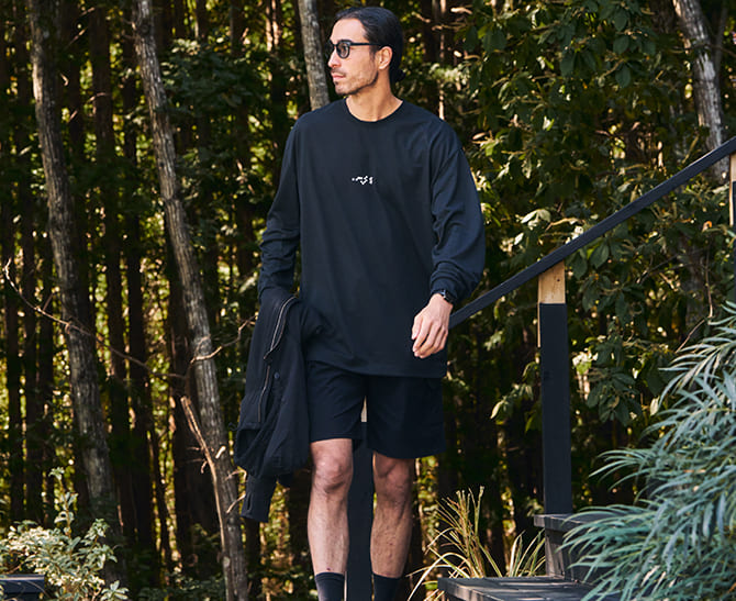 両サイドと背面にポケットが装備されているカーゴショーツは、防しわ加工を施した素材を使用している為カーゴパンツでありながらも、きれいめカジュアルにも使用できます。接触冷感、撥水などの特性も持ち合わせており、ワークアウト使用にも適しています。ウエストはゴムで着脱がラクな仕様にしている事に加え、ワークアウト時には紐で体にフィットさせる事も可能です。